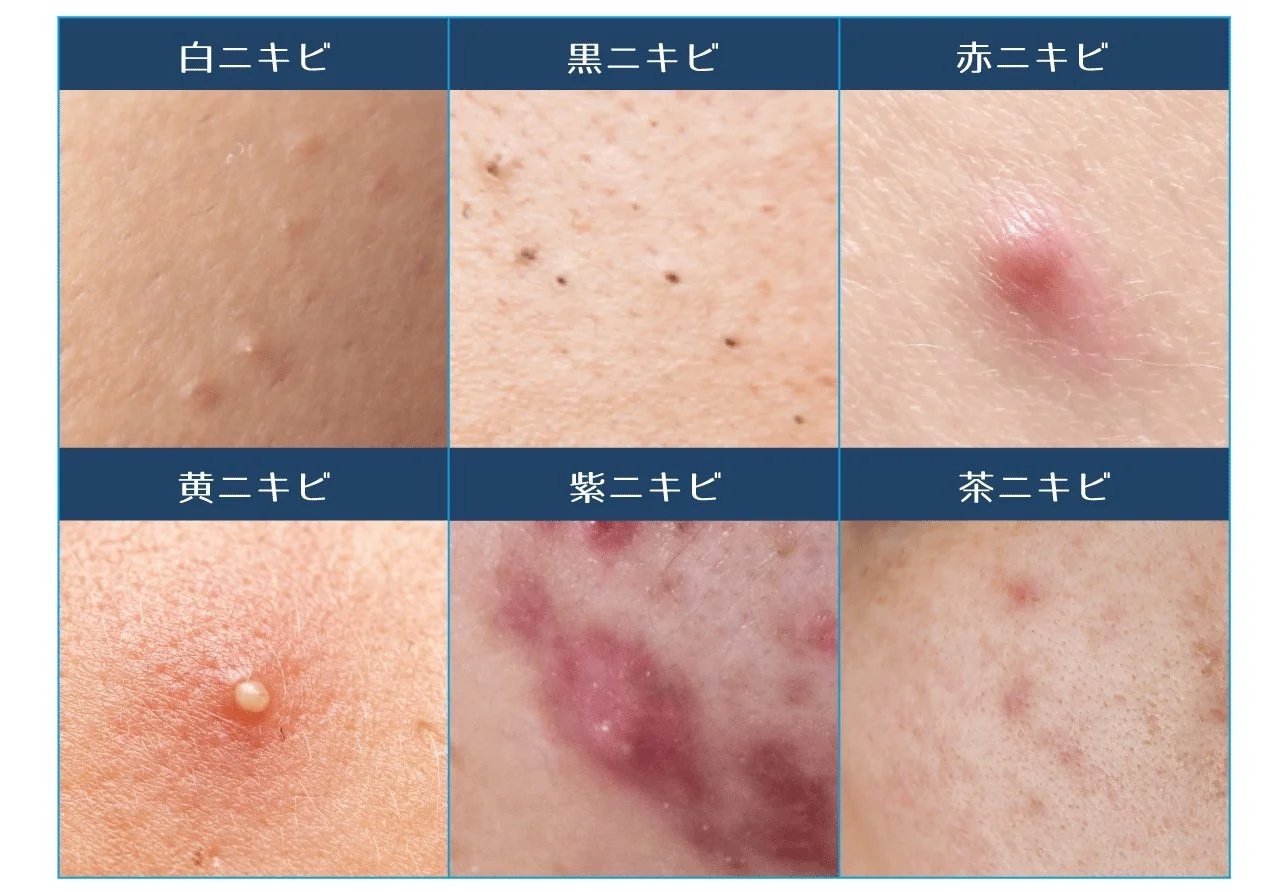 ニキビは、毛穴の詰まり(角栓)、皮脂の過剰分泌、アクネ菌の増殖、炎症などが原因で発生します。主な種類は以下の通りです。