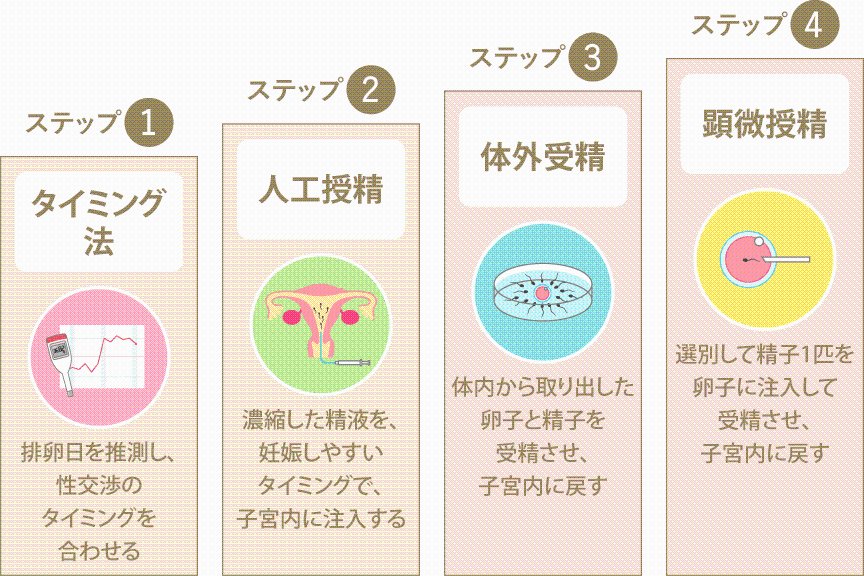 基本検査 → タイミング法 → 人工授精 → 体外受精 → 顕微授精(各ステップで状況に応じた判断)